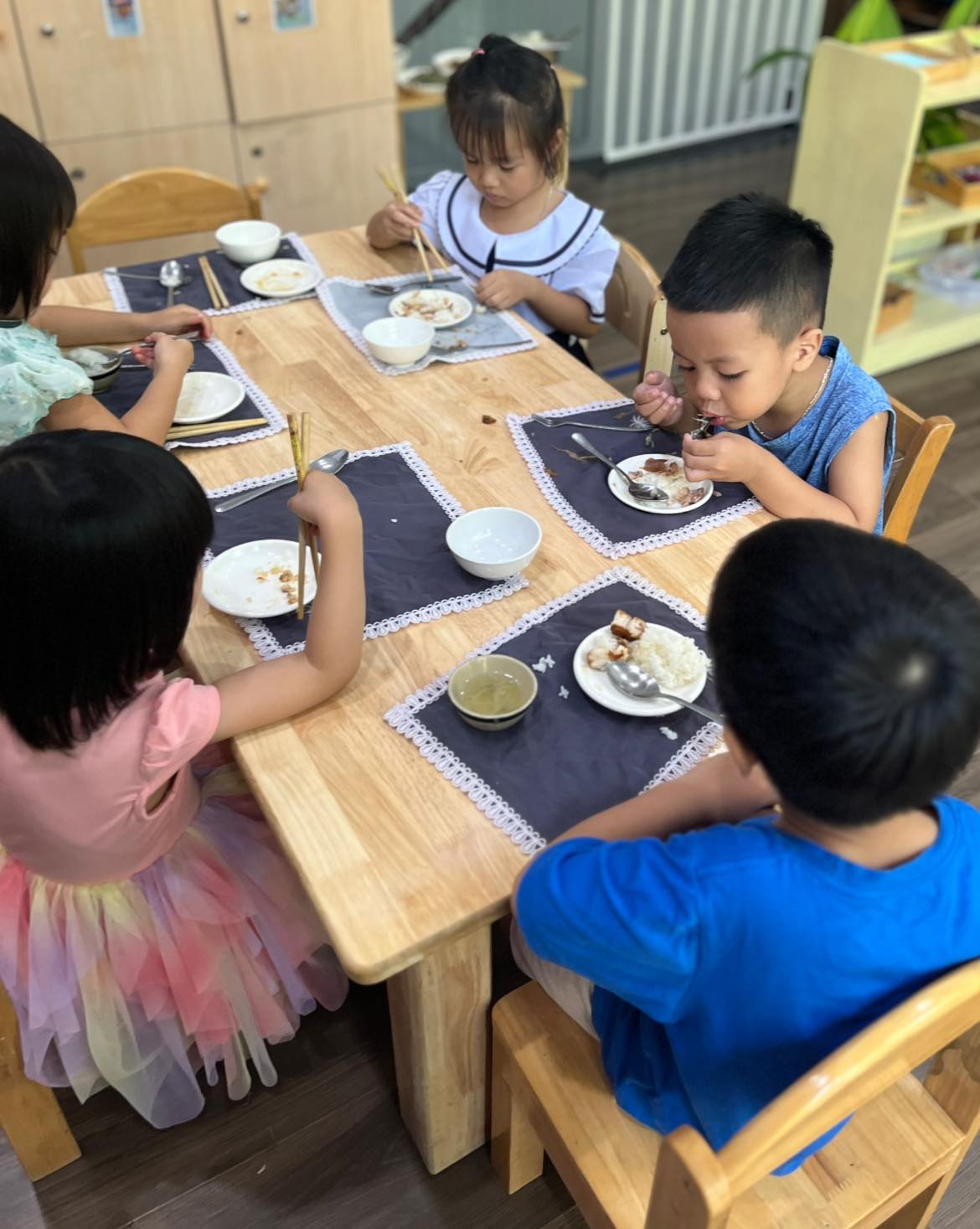 Thực đơn thay đổi linh hoạt, cân đối giữa tinh bột, đạm, rau xanh và vitamin, giúp trẻ duy trì năng lượng ổn định suốt ngày học. Việc rèn thói quen ăn uống khoa học ngay từ sớm cũng góp phần hình thành nếp sống tự lập và kỷ luật cho trẻ.