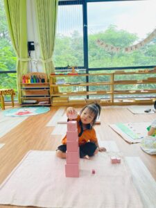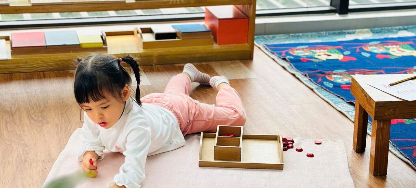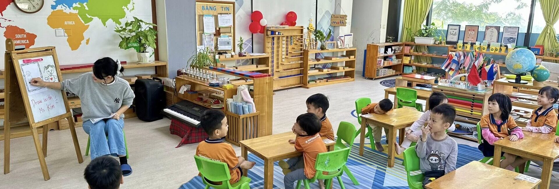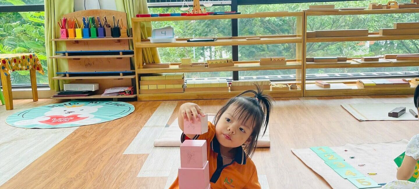 Toàn bộ phòng học được trang bị giáo cụ Montessori chuẩn, đầy đủ cho các lĩnh vực: Thực hành cuộc sống, Cảm quan, Toán học, Ngôn ngữ và Văn hóa. Không gian được bố trí khoa học, tối giản, tạo điều kiện để trẻ tự do di chuyển, lựa chọn hoạt động và làm việc độc lập theo nhịp phát triển cá nhân.