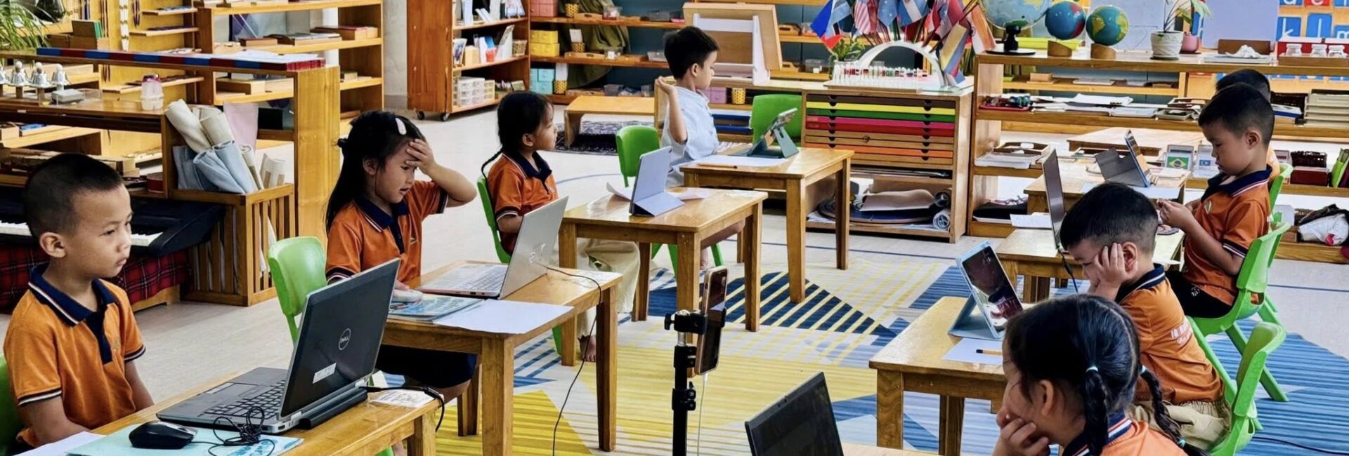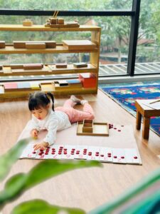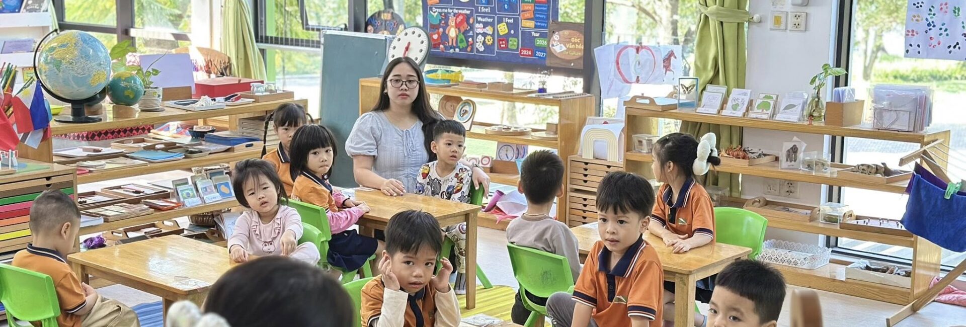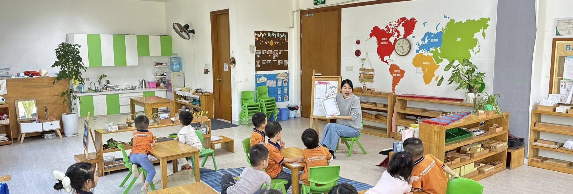 Toàn bộ phòng học được trang bị giáo cụ Montessori chuẩn, đầy đủ cho các lĩnh vực: Thực hành cuộc sống, Cảm quan, Toán học, Ngôn ngữ và Văn hóa. Không gian được bố trí khoa học, tối giản, tạo điều kiện để trẻ tự do di chuyển, lựa chọn hoạt động và làm việc độc lập theo nhịp phát triển cá nhân.