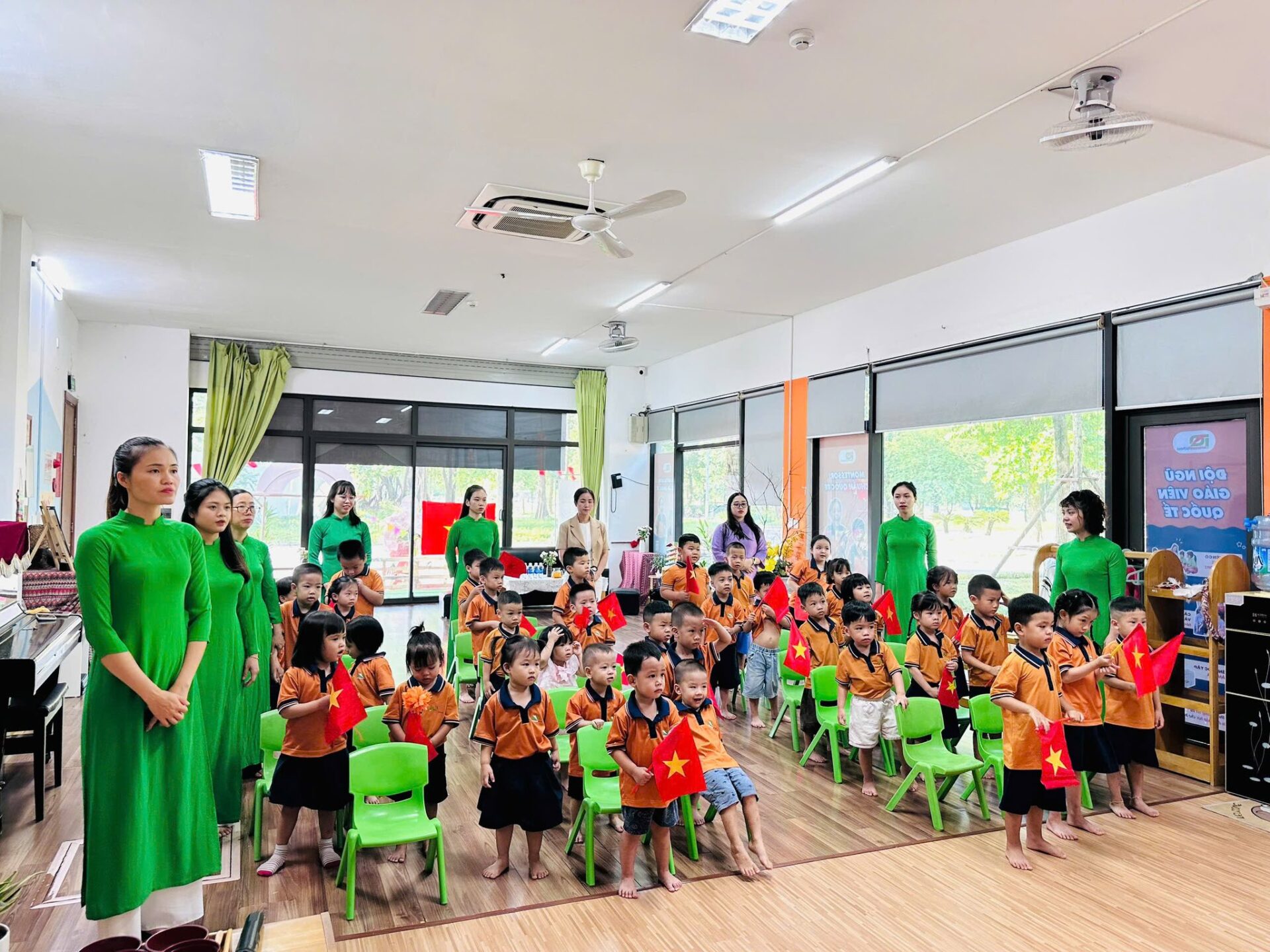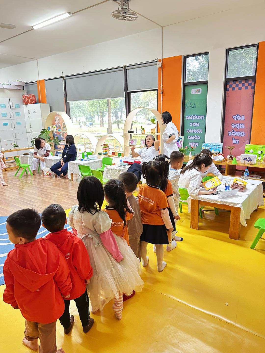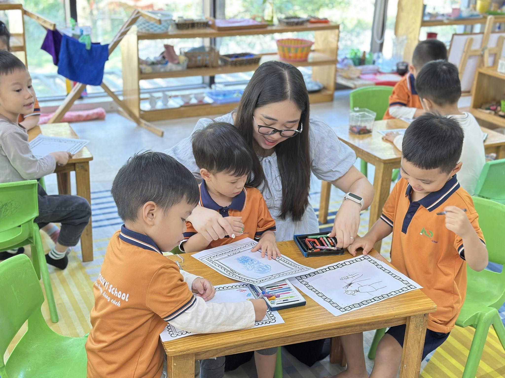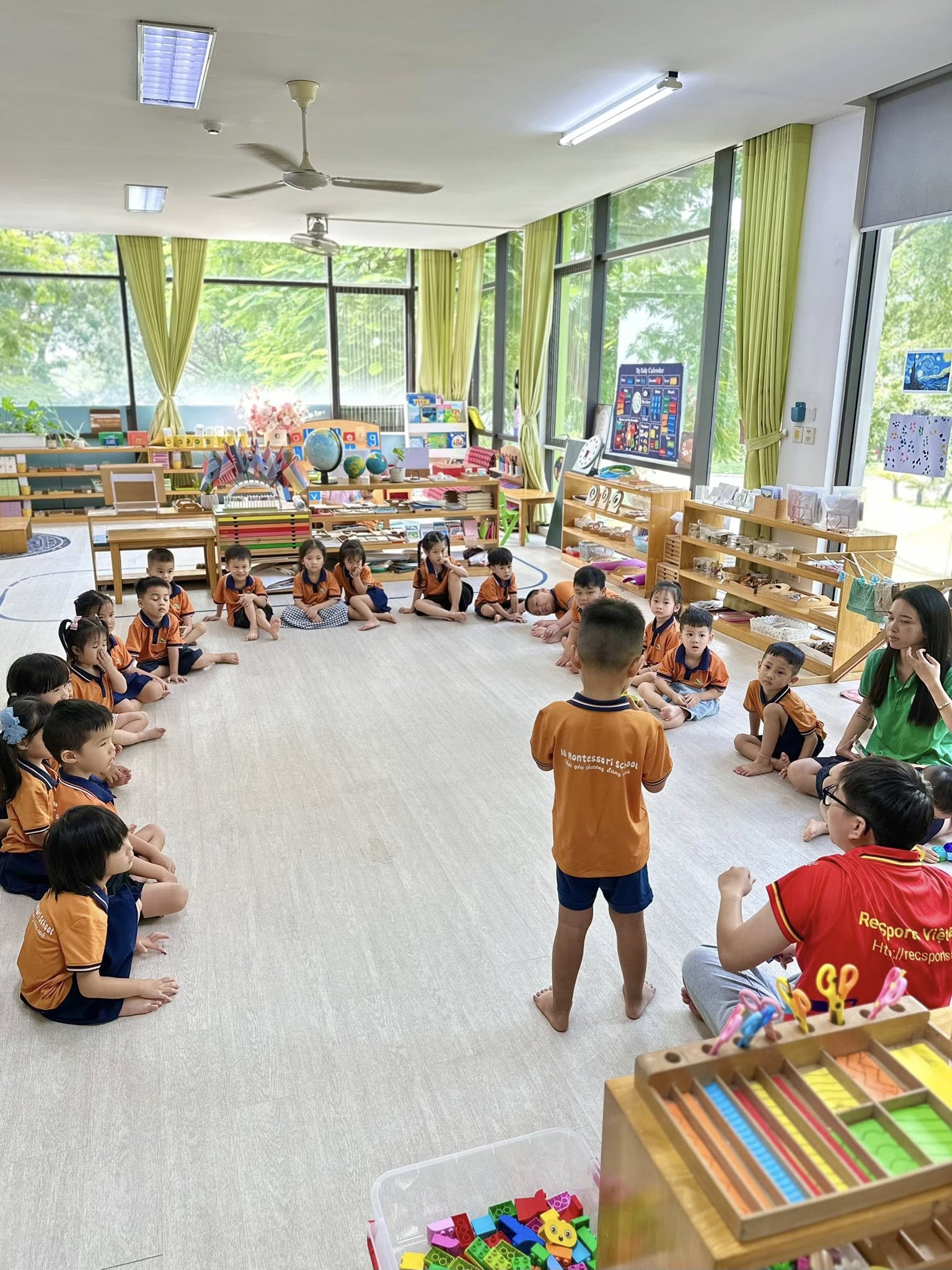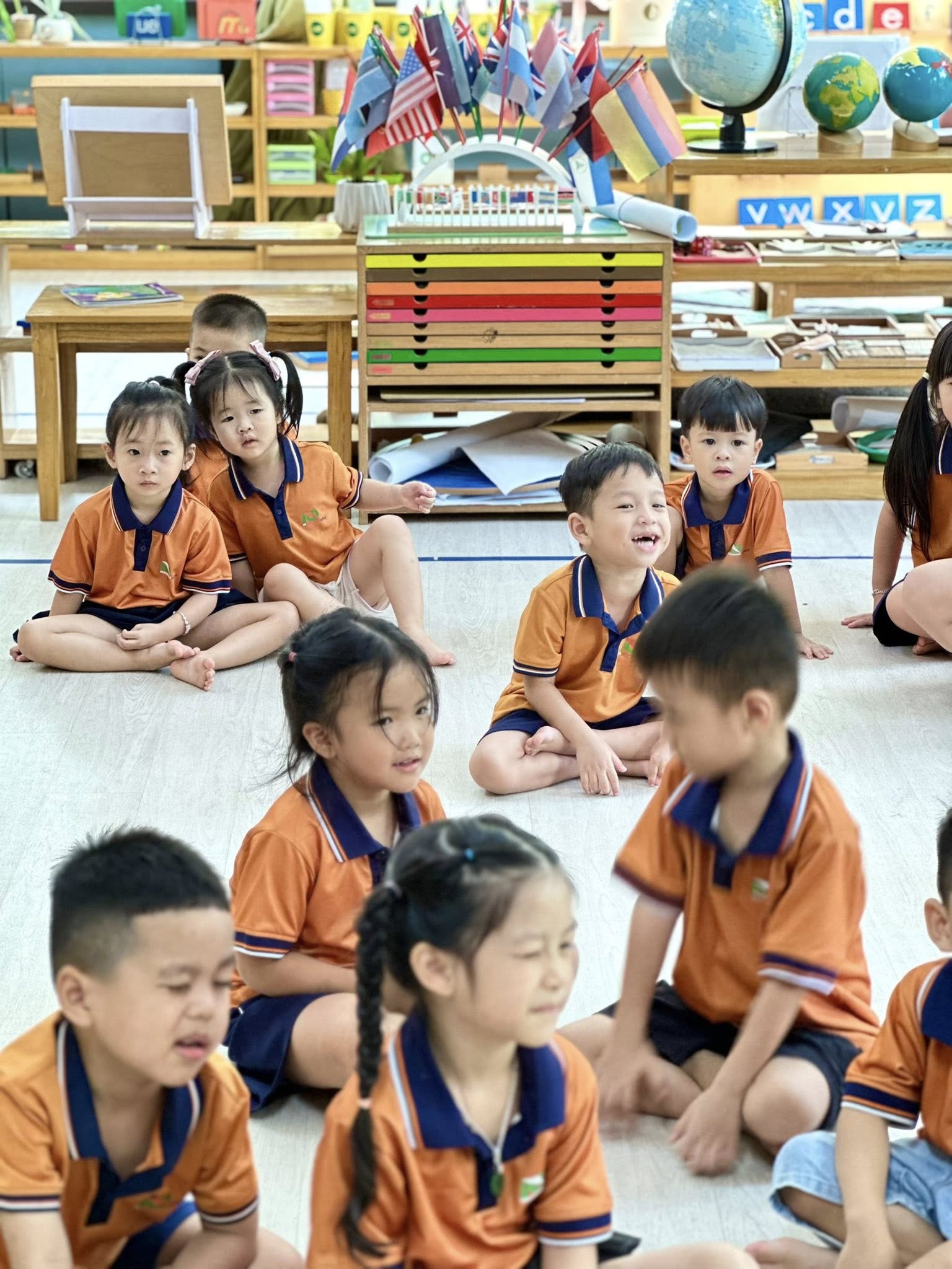Toàn bộ phòng học được trang bị giáo cụ Montessori chuẩn, đầy đủ cho các lĩnh vực: Thực hành cuộc sống, Cảm quan, Toán học, Ngôn ngữ và Văn hóa. Không gian được bố trí khoa học, tối giản, tạo điều kiện để trẻ tự do di chuyển, lựa chọn hoạt động và làm việc độc lập theo nhịp phát triển cá nhân.