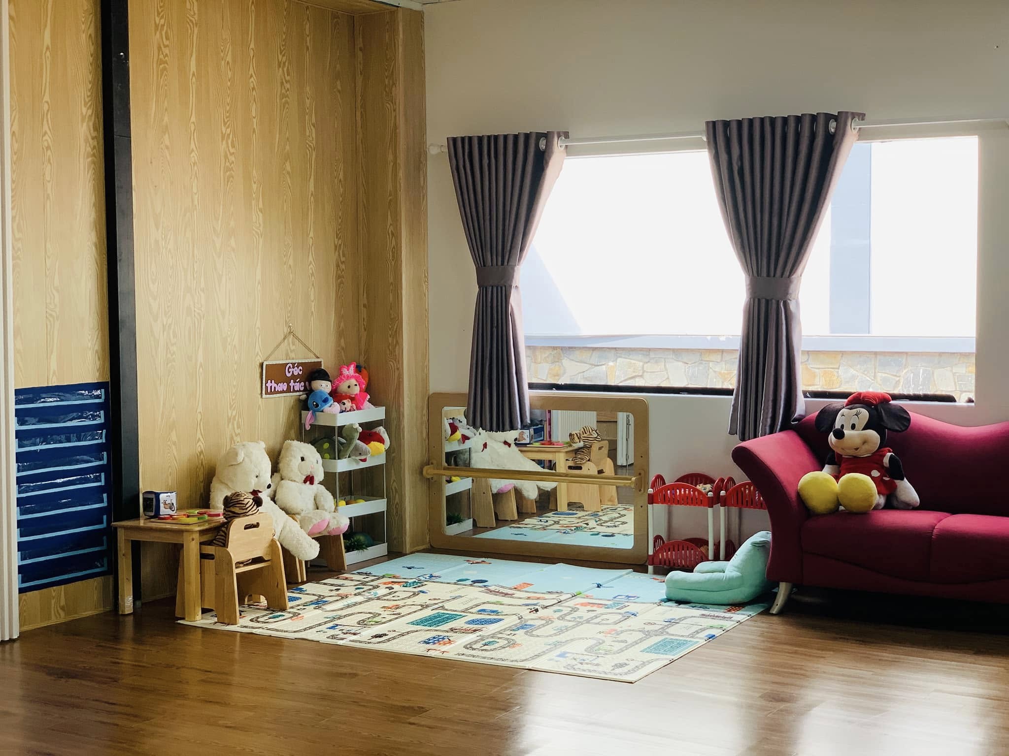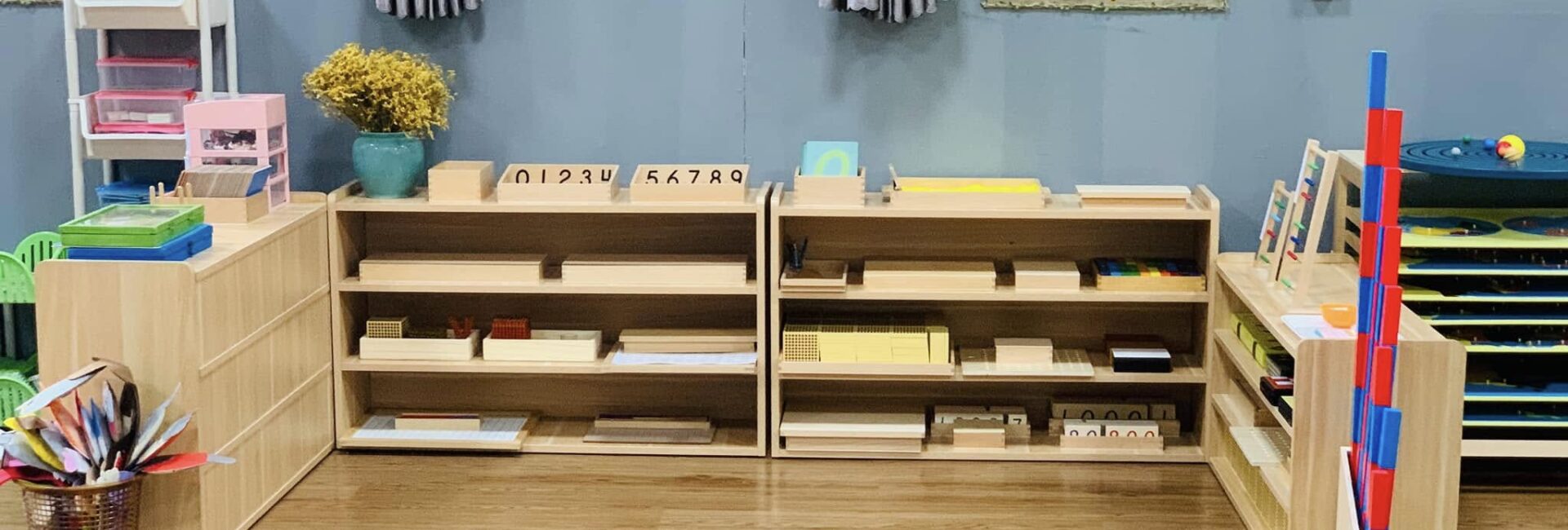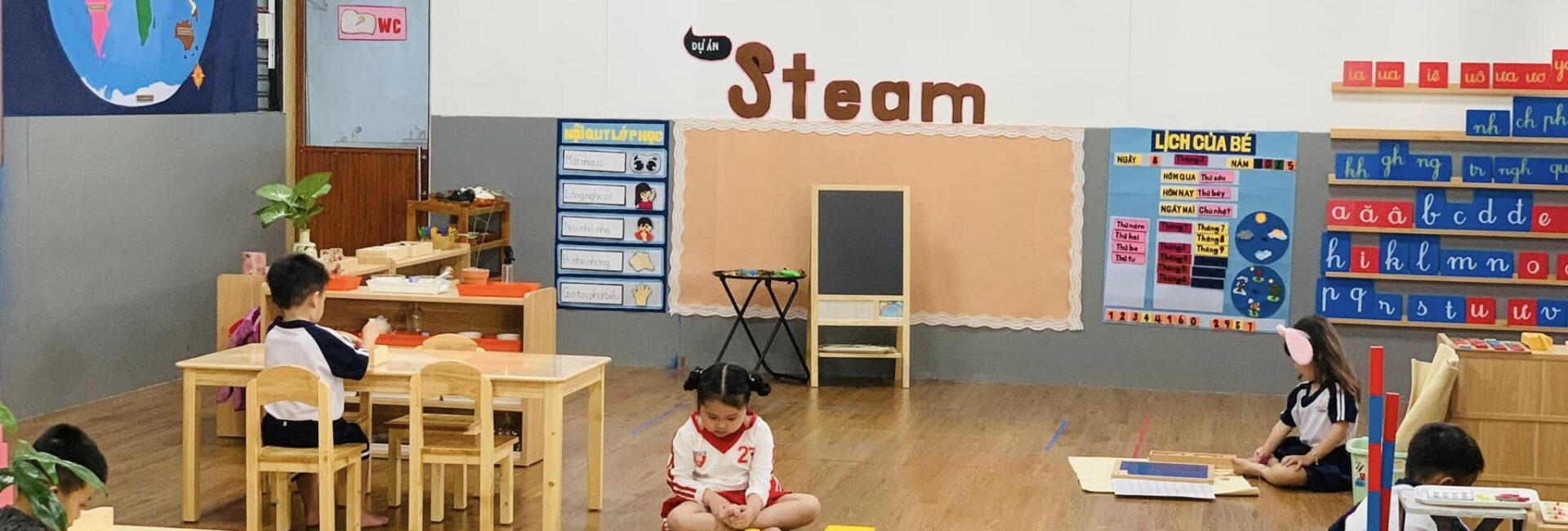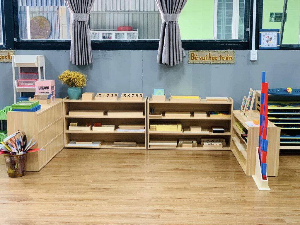 Mỗi khu vực lớp học được bố trí đầy đủ học cụ Montessori đạt chuẩn, sắp xếp khoa học theo nguyên tắc “trật tự – thẩm mỹ – dễ tiếp cận”. Ánh sáng tự nhiên và màu sắc nhẹ nhàng tạo điều kiện cho trẻ dễ dàng tập trung, đồng thời khơi gợi sự tò mò và tinh thần tự lập trong từng hoạt động hàng ngày.