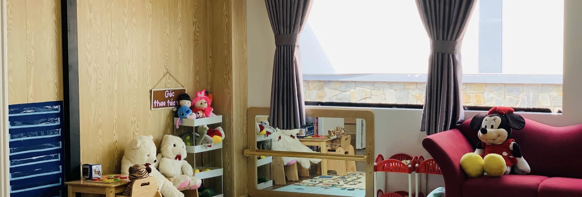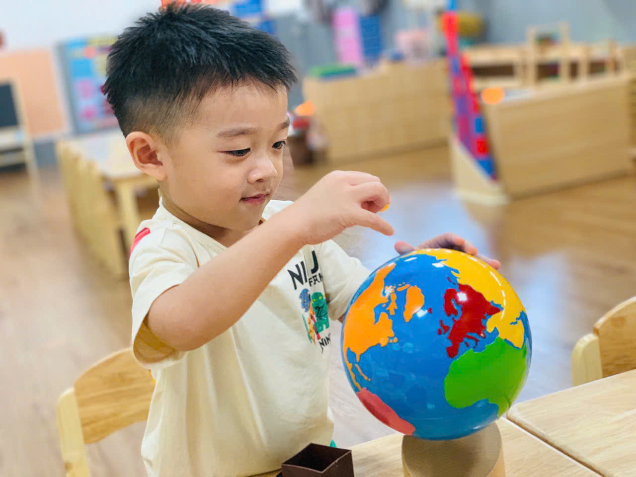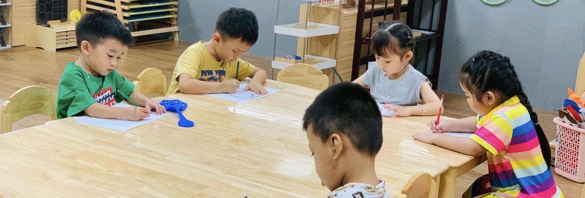Mỗi khu vực lớp học được bố trí đầy đủ học cụ Montessori đạt chuẩn, sắp xếp khoa học theo nguyên tắc “trật tự – thẩm mỹ – dễ tiếp cận”. Ánh sáng tự nhiên và màu sắc nhẹ nhàng tạo điều kiện cho trẻ dễ dàng tập trung, đồng thời khơi gợi sự tò mò và tinh thần tự lập trong từng hoạt động hàng ngày.
