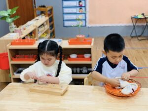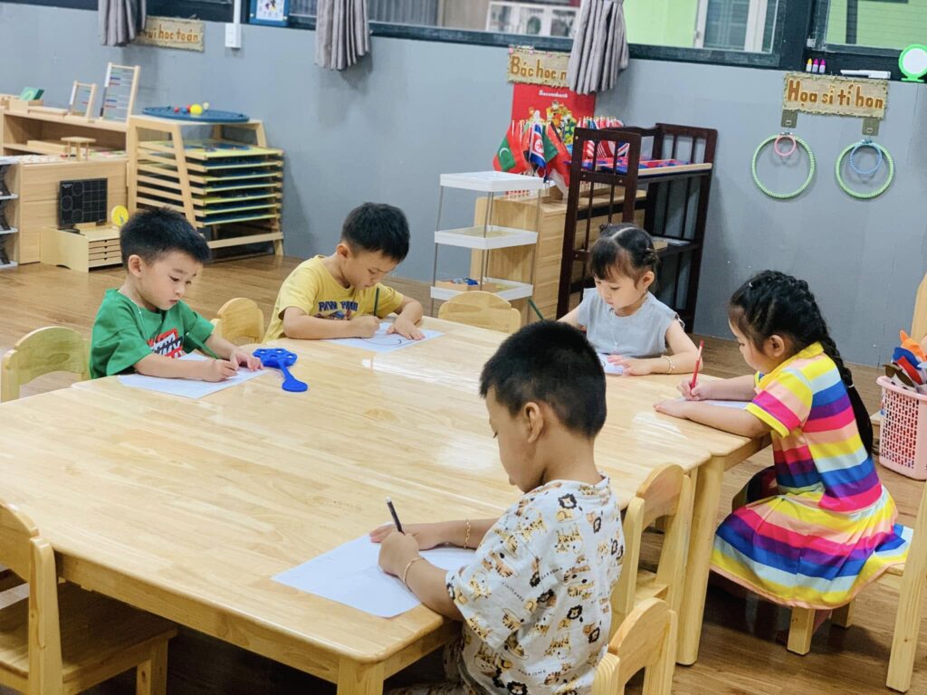 Điểm đặc biệt của chương trình là trẻ được tự do lựa chọn hoạt động, tự chịu trách nhiệm với quyết định của mình, từ đó hình thành tính tự lập, kỷ luật nội tâm và khả năng tư duy độc lập. Nhà trường luôn khuyến khích “học mà chơi – chơi mà học”, tạo cho trẻ cảm giác mỗi ngày đến lớp là một hành trình khám phá đầy hứng khởi.
