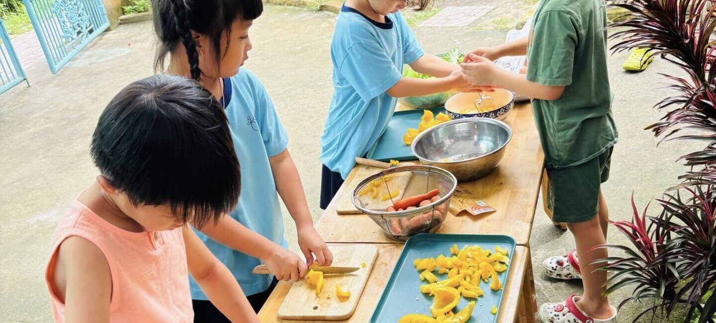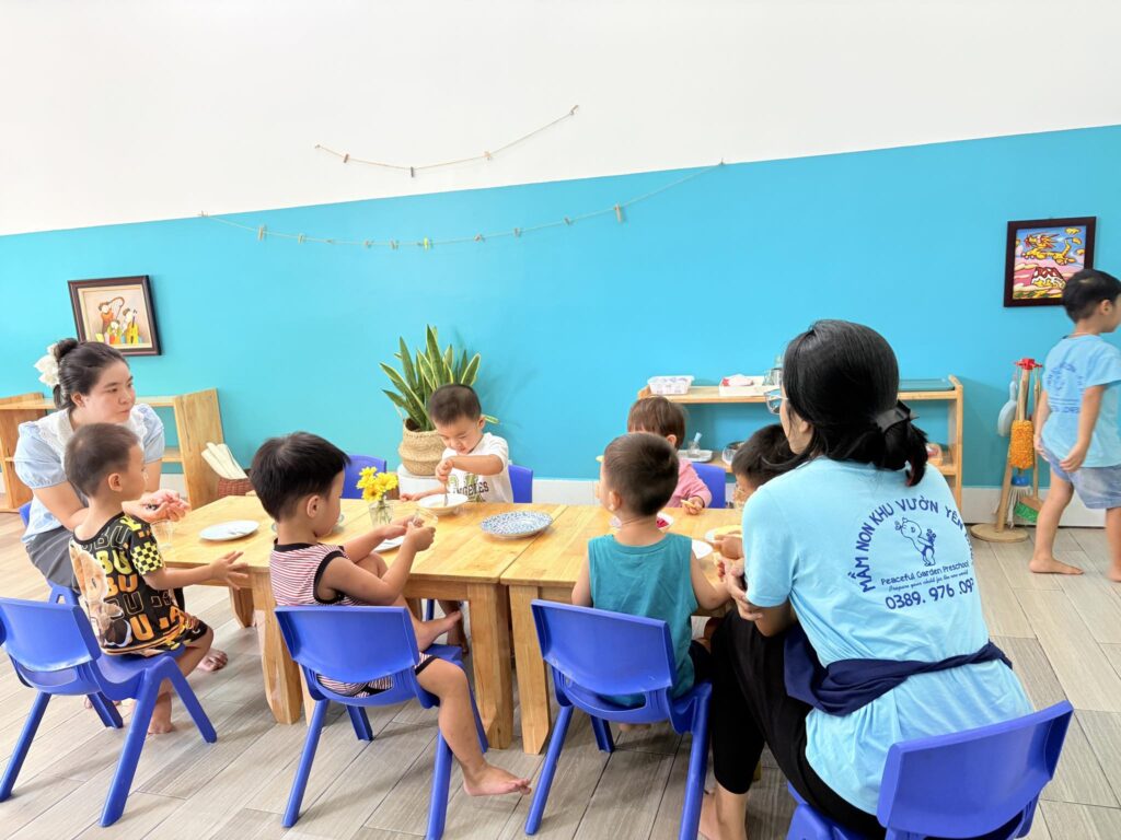 Giáo viên luôn đồng hành, khuyến khích trẻ ăn uống tự lập, ăn đa dạng, hình thành thói quen lành mạnh ngay từ sớm. Vườn rau hữu cơ trong khuôn viên trường cũng góp phần cung cấp thực phẩm sạch và tạo điều kiện cho trẻ hiểu hơn về hành trình từ gieo trồng đến bữa ăn hàng ngày.
