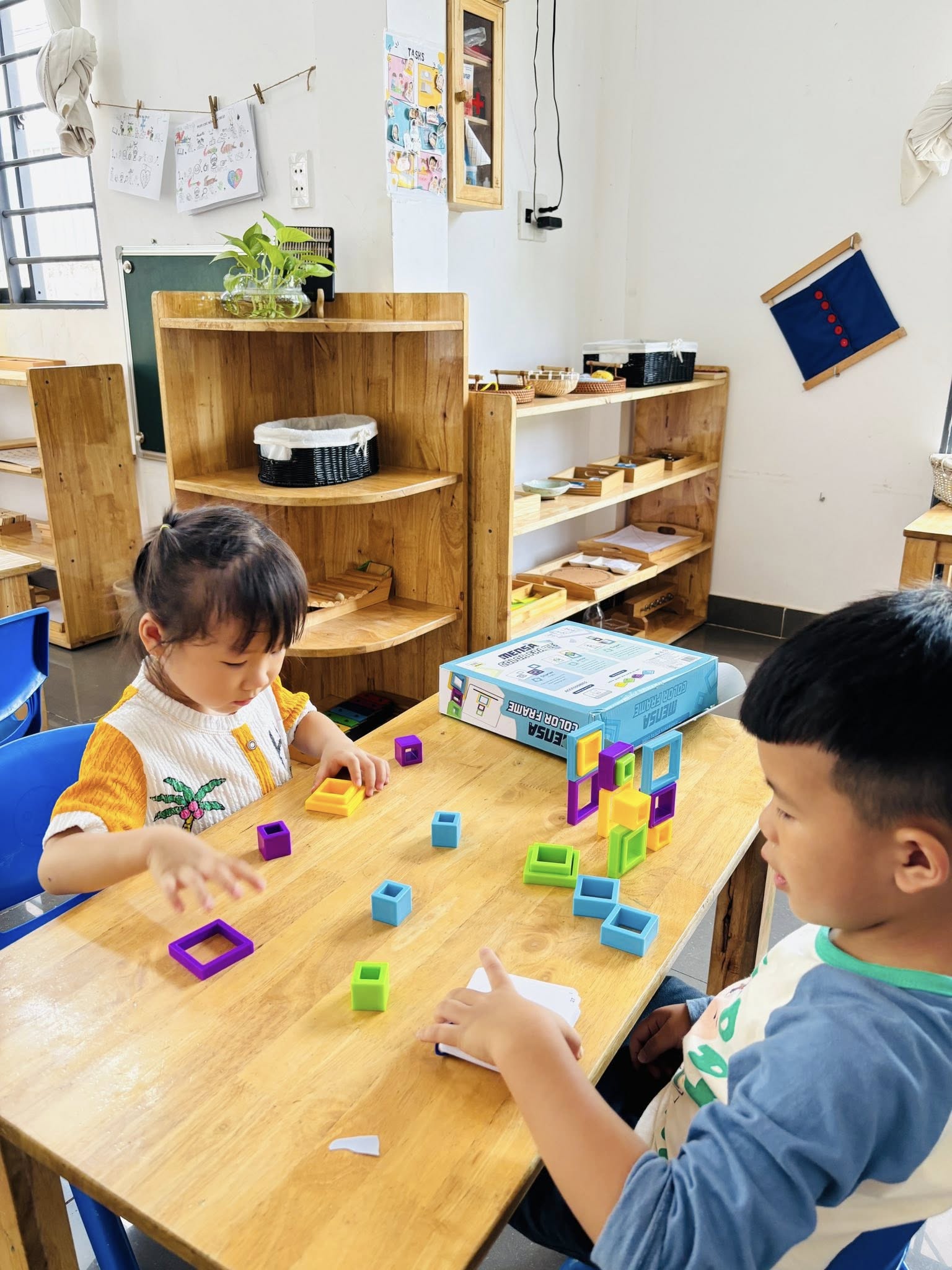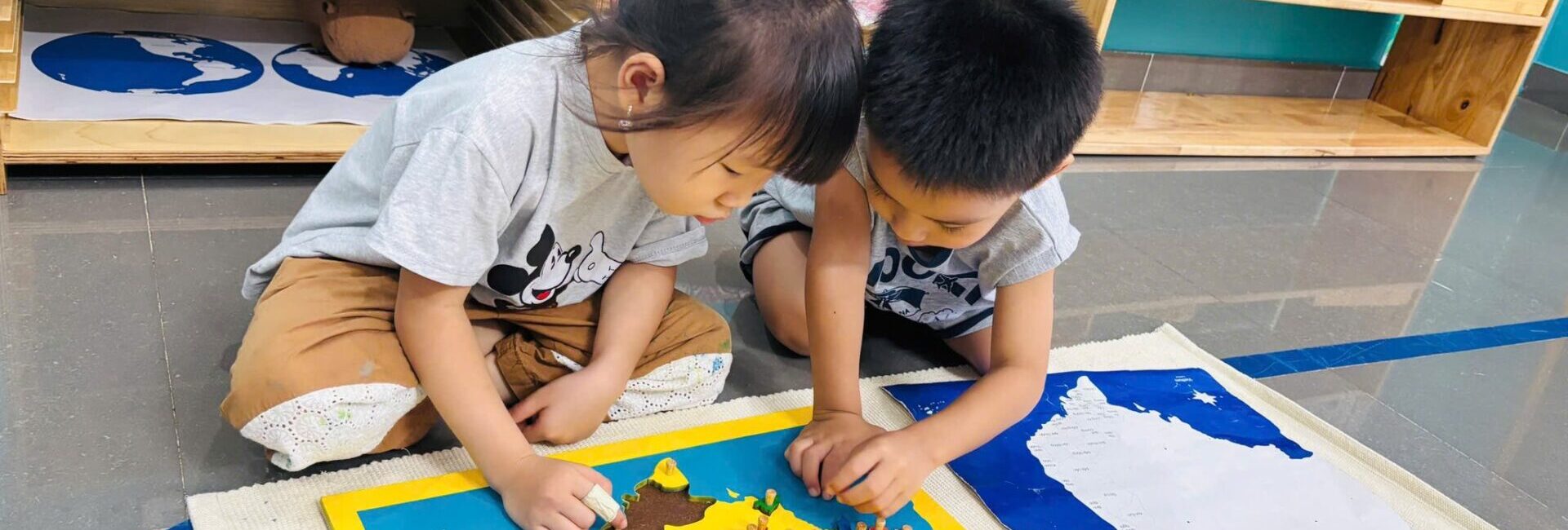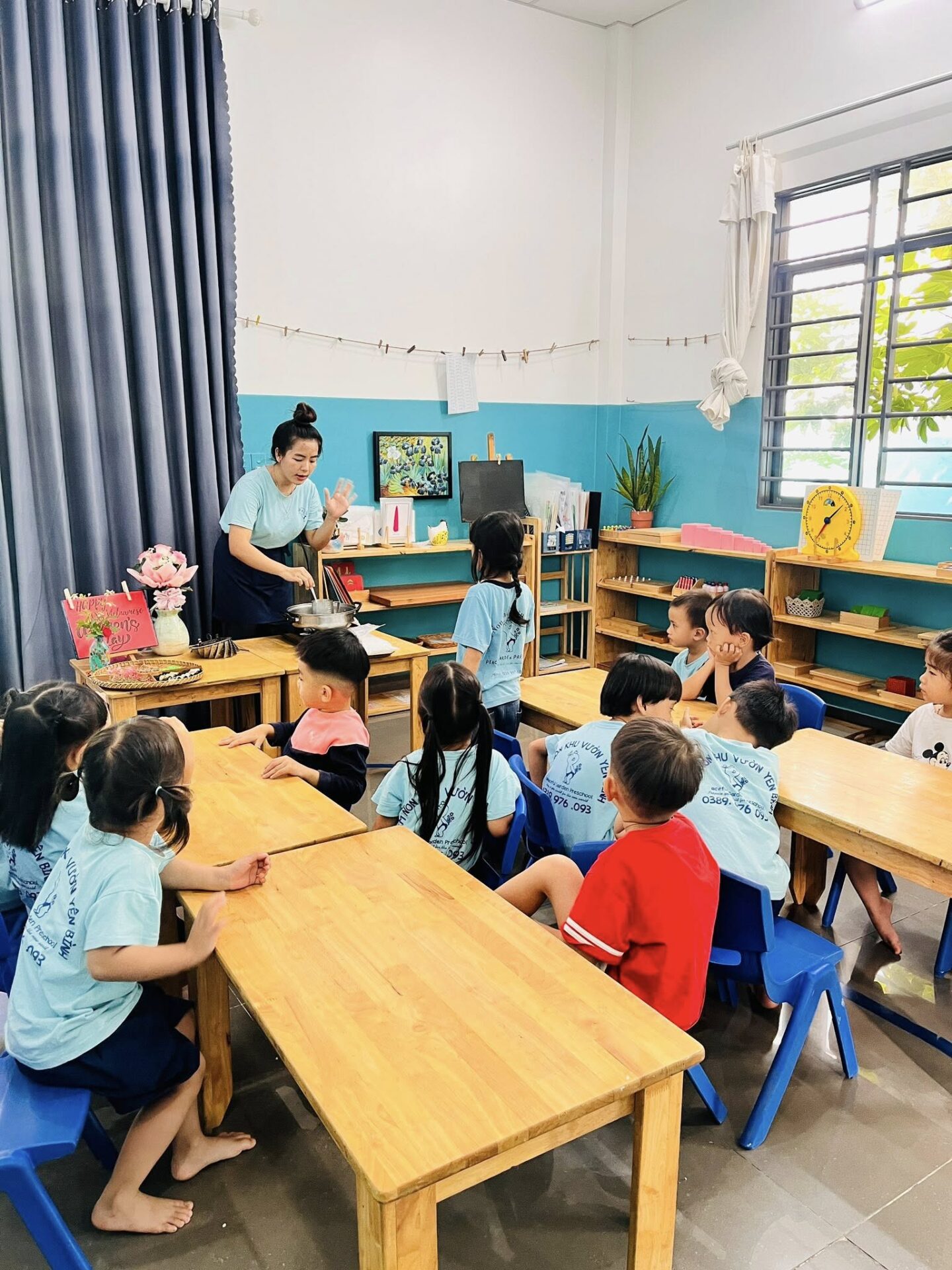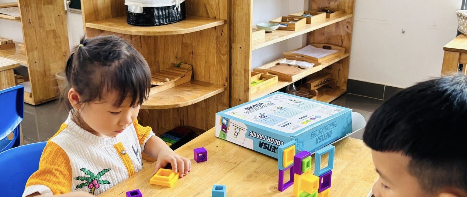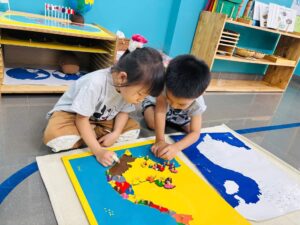 - Trẻ có khoảng 2 giờ hoạt động Montessori, tập trung vào rèn luyện giác quan, kỹ năng tự phục vụ, làm quen toán học, chữ viết, ngôn ngữ tiếng Anh, văn hóa – địa lý thế giới.