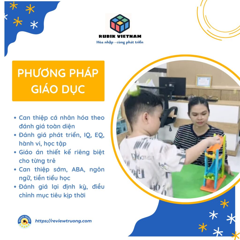 Rubik Việt Nam triển khai mô hình can thiệp cá nhân hóa, dựa trên kết quả sàng lọc – đánh giá toàn diện: phát triển, IQ, EQ, khả năng học tập, hành vi – cảm xúc. Trên cơ sở đó, chuyên gia xây dựng giáo án riêng biệt cho từng trẻ, không áp dụng chương trình đại trà.