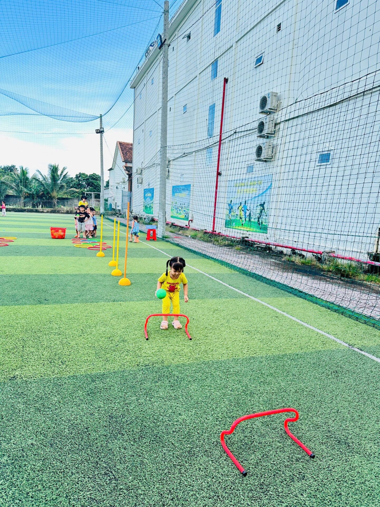• Không gian rèn luyện vận động: Sự hiện diện của bể bơi mini, sân bóng cỏ nhân tạo, và khu vui chơi vận động ngoài trời cho thấy sự đầu tư nghiêm túc vào phát triển thể chất thô và kỹ năng tương tác nhóm, một chỉ số quan trọng trong giáo dục sớm.