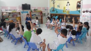 Mầm non Quỳnh Anh tổ chức chương trình Tiếng Anh hàng ngày, với sự kết hợp giữa giáo viên Việt Nam và giáo viên bản ngữ. Trẻ tiếp cận ngôn ngữ thứ hai thông qua các hoạt động tự nhiên như trò chơi, hát, vận động, nghe – lặp lại âm thanh, giúp hình thành phản xạ sớm.