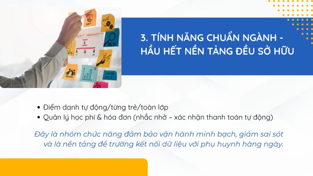 Đây là nhóm chức năng đảm bảo vận hành minh bạch, giảm sai sót và là nền tảng để trường kết nối dữ liệu với phụ huynh hàng ngày.