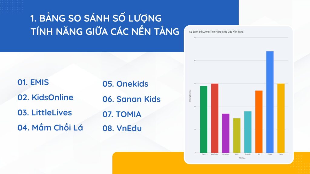 Dựa vào dữ liệu, TOMIA hiện là phần mềm có số lượng tính năng nhiều hơn các nền tảng còn lại, phù hợp với những trường cần giải pháp tổng thể, bao quát từ quản lý hành chính đến chăm sóc – học tập – kết nối phụ huynh. Những nền tảng khác vẫn là lựa chọn phổ biến nhờ tính ổn định, dễ sử dụng và phù hợp từng quy mô trường.